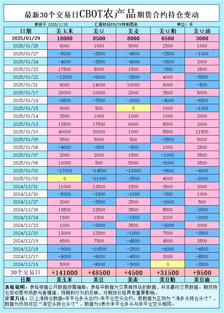 豆油期货在1月29日上涨300美分,主要受到大宗商品基金净多头持仓增加的支撑。从持仓数据来看,大宗商品基金在最近5个交易日内增加了3,000手豆油净多头头寸,显示出市场对豆油价格的看涨情绪。然而,豆油价格的涨幅受到大豆供应充足和需求疲软的限制,短期内可能维持震荡走势。