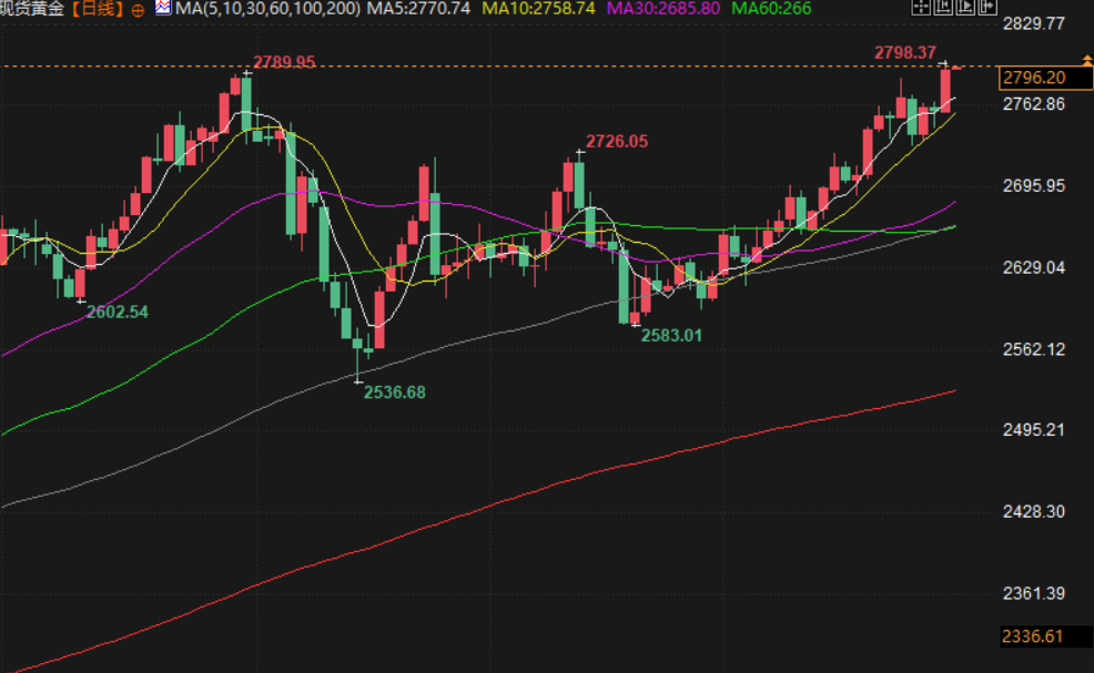 现货金报每盎司2,794.69美元,上涨1.3%,盘初触及2798.24美元的历史最高水平。美国期金 攀升1.9%,至2,822.30美元。