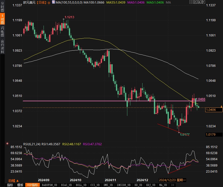 欧元兑美元将面临高度的不确定性。如果利率继续下降,尤其是在政策声明中放宽未来加息的预期,欧元的进一步疲软将不可避免。技术面来看,若EUR/USD跌破1.0355支撑位,则可能会进入更深的调整区间,特别是考虑到美国经济数据相对稳健,美元仍具备相对强势的基本面支撑。