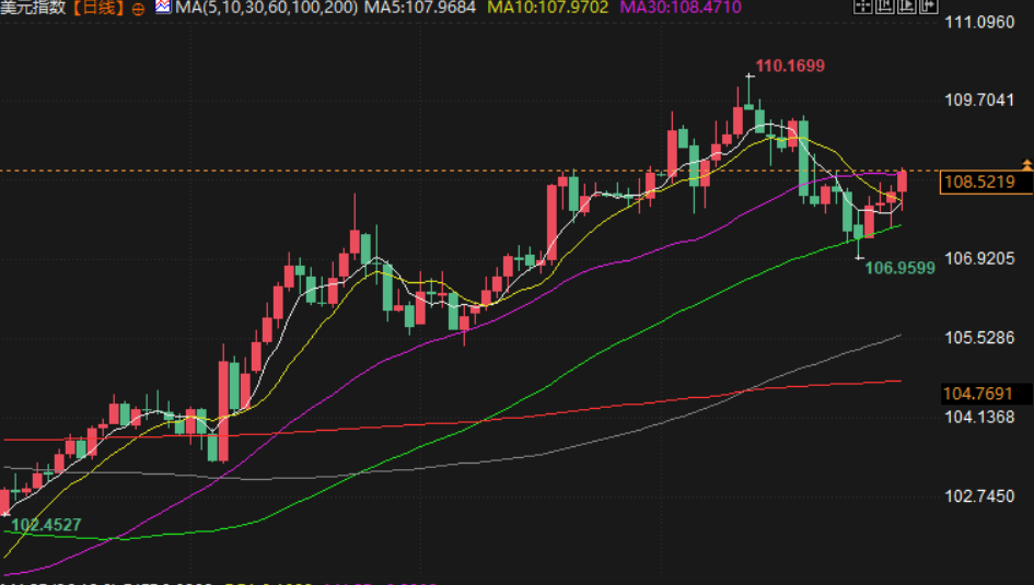 美元指数上涨 0.31%, 至 108.42,本周上涨 0.93%,结束了连续两周的跌势。