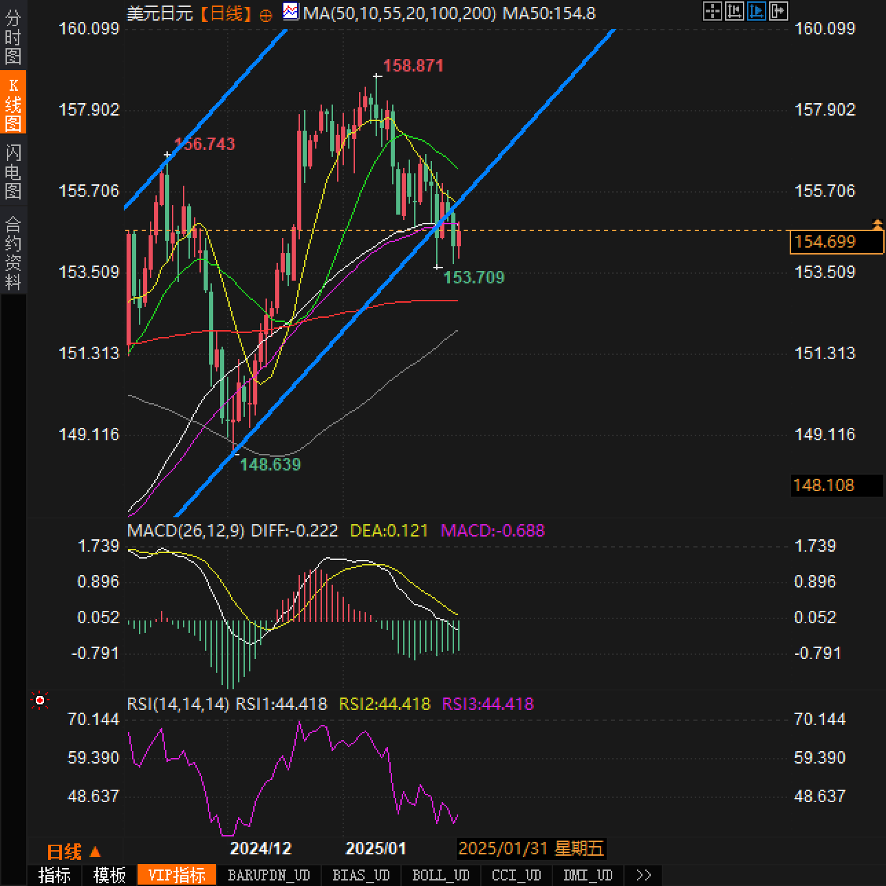 总结来说,美元/日元当前的技术面走势显示出一定的下行压力,但如果市场情绪恢复或美元出现强势反弹,汇率可能会出现短期的回升。技术面的重要支撑位和阻力位将是决定未来几日走势的关键,特别是在153.70、153.00、152.00以及155.00、156.00等关键价位附近,市场密切关注这些水平的突破情况。