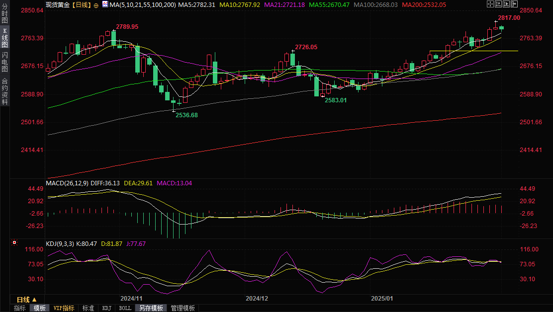 现货黄金震荡走软,一度跌至2785美元附近,目前交投于2793.18美元/盎司附近,跌幅约0.45%,因美国总统特朗普上周六(2月1日)下令从周二(2月4日)开始对加拿大和墨西哥进口商品征收25%的关税,对来自中国的商品征收10%的关税,