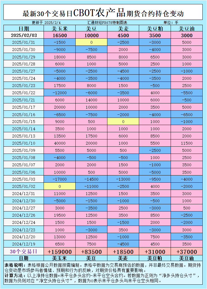 从持仓数据来看,基金在2月3日增加了4500手小麦净多头头寸,显示出市场对小麦价格的看涨情绪。尽管短期内出口需求疲软,但市场对加拿大小麦进口放缓的预期以及特朗普关税言论的缓和,为小麦价格提供了支撑。未来,小麦市场的走势将取决于冬小麦的生长状况以及国际贸易局势的进一步发展。