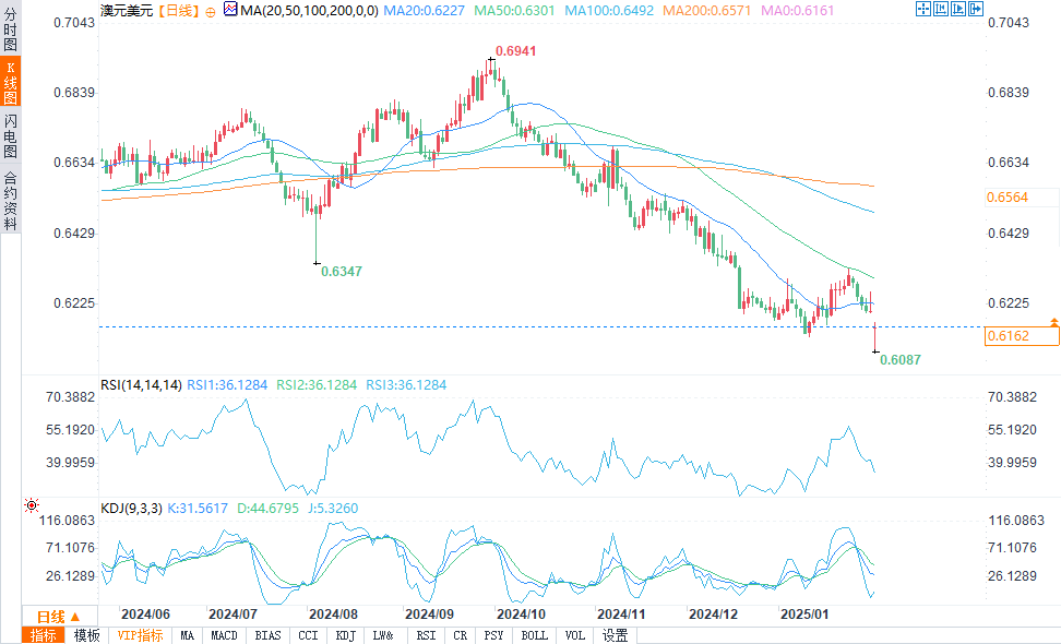 周一(2月3日)欧盘时段,澳元/美元盘中走跌,报0.6158,跌幅0.82%。在特朗普宣布大规模关税引发贸易战后,澳元/美元汇率大幅下跌。在美联储决定和美国通胀数据公布后,澳元/美元汇率跌至0.6210的低点,为2025年1月以来的最低点。