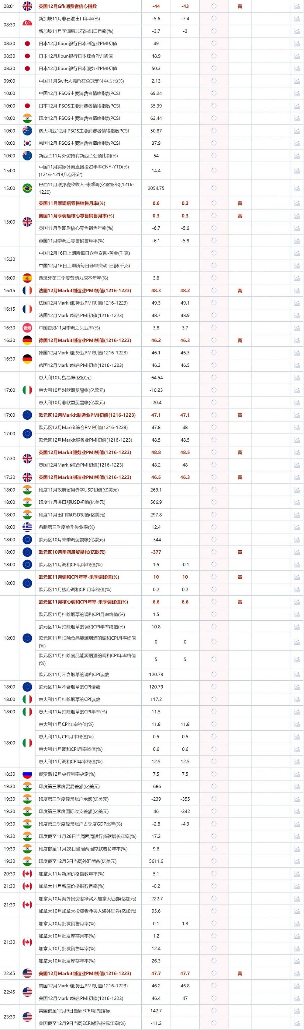 22:45 美国12月Markit制造业PMI初值(1216-1223) , 前值 47.7 , 预期值 47.7 , 公布值:待发布22:45 美国12月Markit服务业PMI初值(1216-1223) , 前值 46.2 , 预期值 46.8 , 公布值:待发布