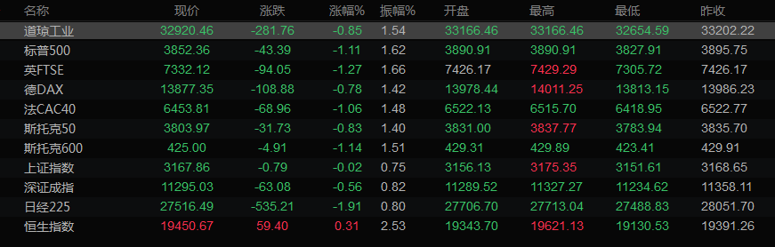 美股收盘情况: 道琼斯工业指数下跌0.85%,至32920.46点;