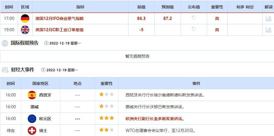 ①12月19日(周一)关键字:德国12月IFO商业景气指数,欧洲央行副行长金多斯