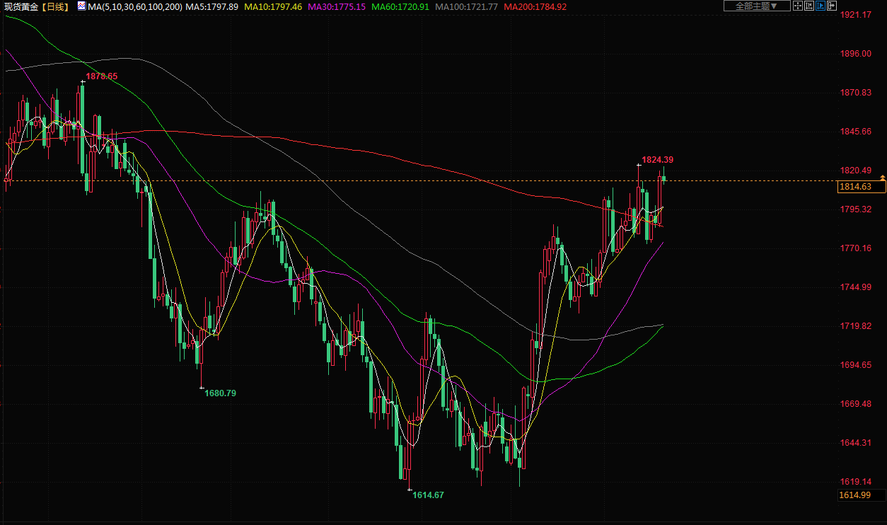 金价周三持平,维持在1800美元的关键水平之上,美国加息放缓的预期提供了支撑,但美元上涨限制了进一步的涨势。