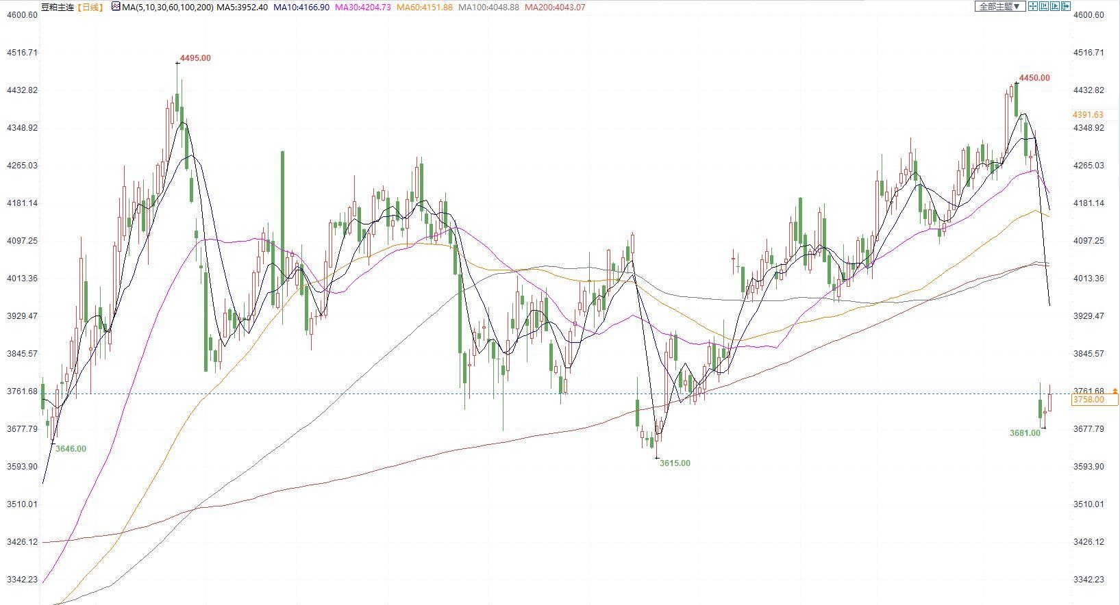 豆粕2305合约日内涨1.40%,收盘价3758元/吨,现货张家港43%蛋白豆粕4600元/吨