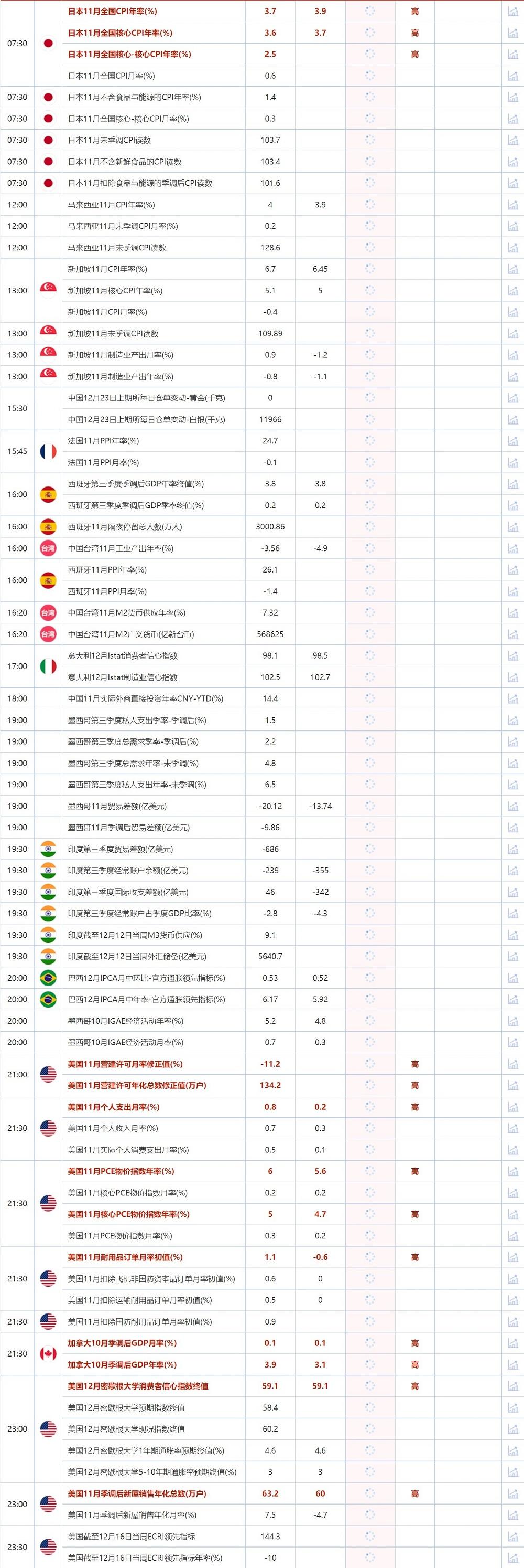 07:30 日本11月全国核心CPI年率(%) , 前值 3.6 , 预期值 3.7 , 公布值:待发布07:30 日本11月全国核心-核心CPI年率(%) , 前值 2.5 , 预期值 -- , 公布值:待发布07:30 日本11月全国CPI月率(%) , 前值 0.6 , 预期值 -- , 公布值:待发布