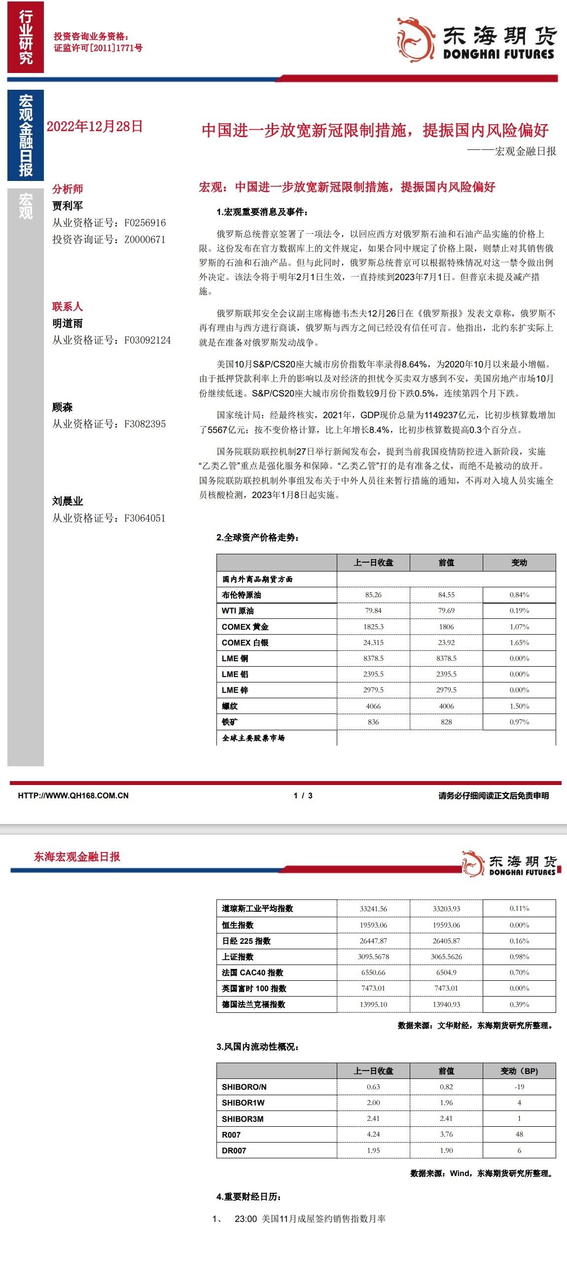 标题:【东海期货12月28日宏观金融日报】:中国进一步放宽新冠限制措施,提振国内风险偏好