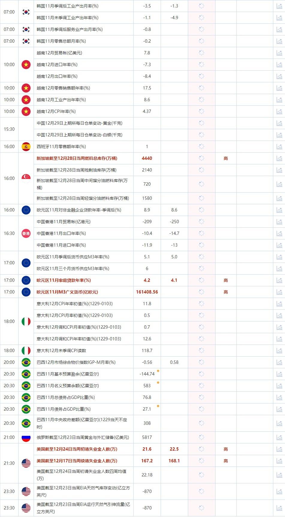 17:00 欧元区11月家庭贷款年率(%) , 前值 4.2 , 预期值 4.1 , 公布值:待发布17:00 欧元区11月M3广义货币(亿欧元) , 前值 161408.56 , 预期值 -- , 公布值:待发布18:00 意大利12月CPI年率初值(%)(1229-0103) , 前值 11.8 , 预期值 -- , 公布值:待发布