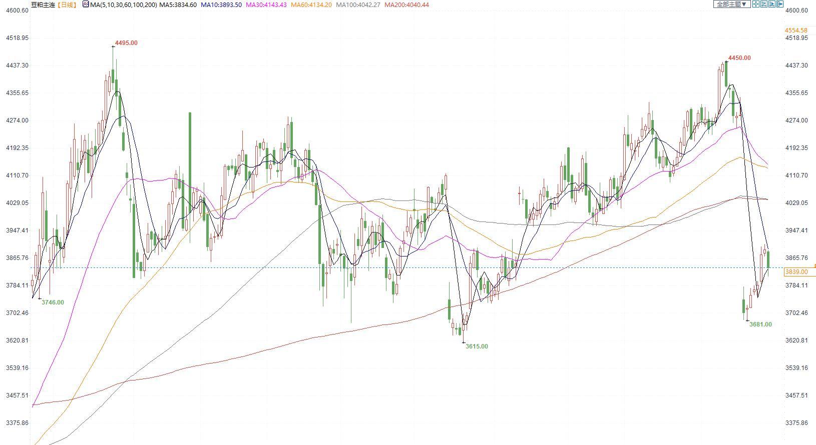 豆粕2305合约日内跌1.31%,收盘价3839元/吨,现货张家港43%蛋白豆粕4645元/吨