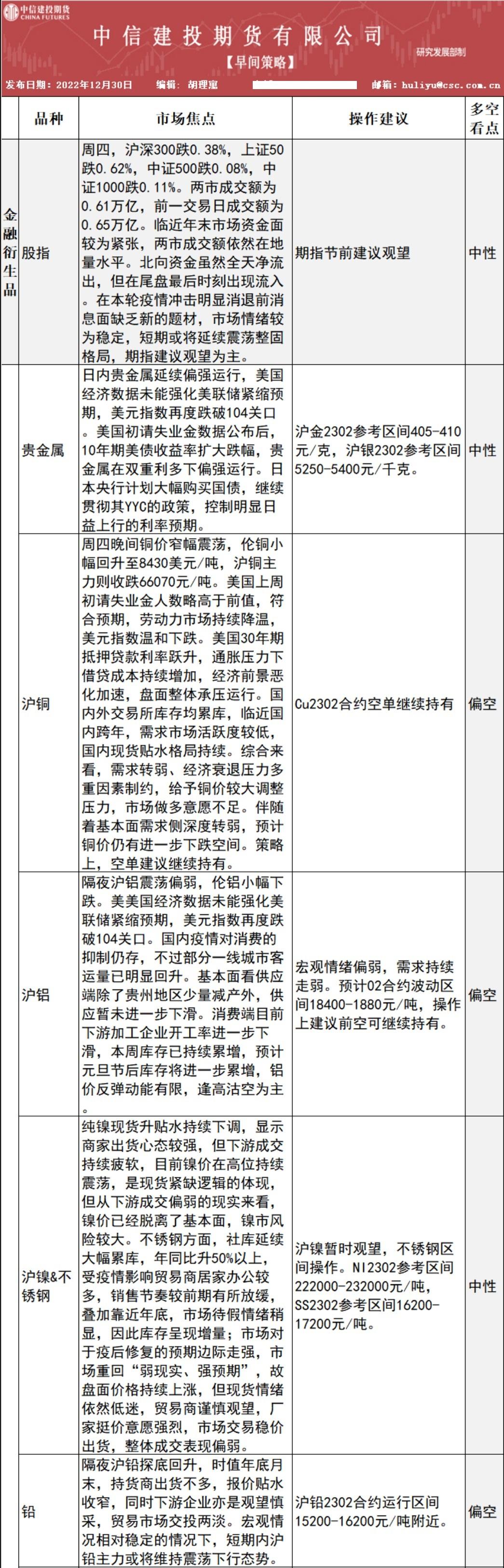 标题:中信建投期货12月30日早间交易策略