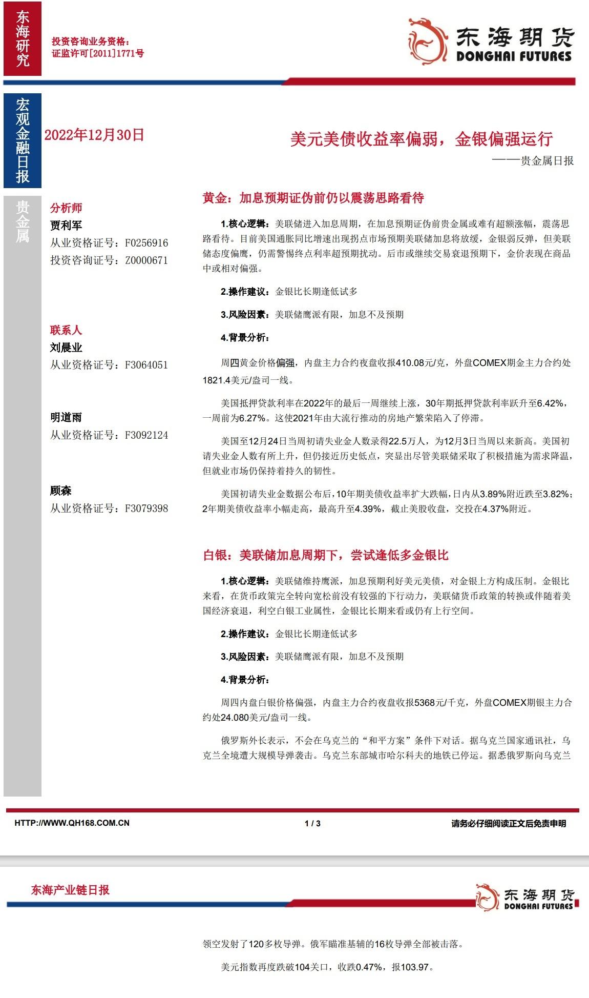 标题:【东海期货12月30日产业链日报】贵金属篇:美元美债收益率偏弱,金银偏强运行