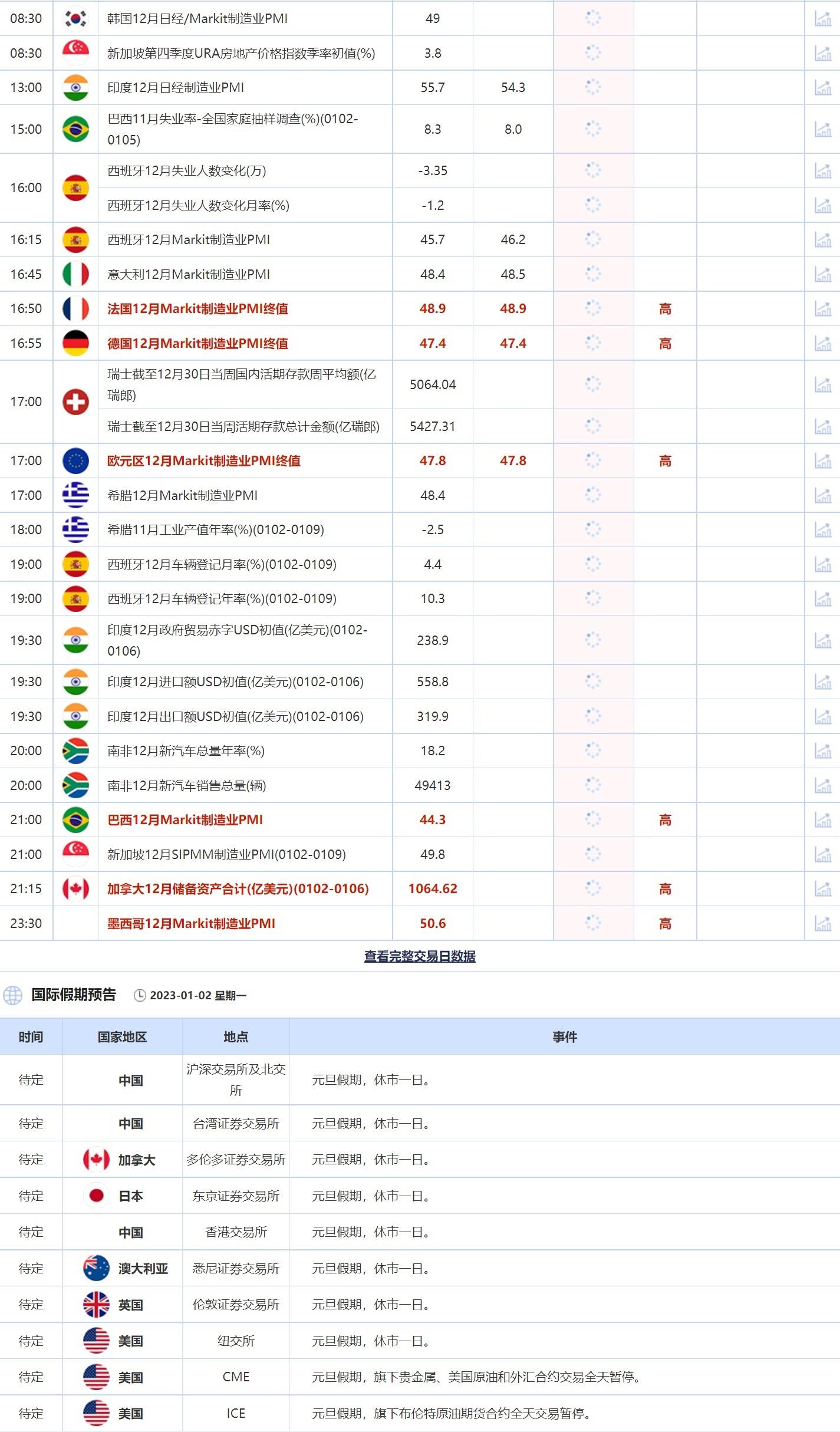 21:15 加拿大12月储备资产合计(亿美元)(0102-0106) , 前值 1064.62 , 预期值 -- , 公布值:待发布23:30 墨西哥12月Markit制造业PMI , 前值 50.6 , 预期值 -- , 公布值:待发布