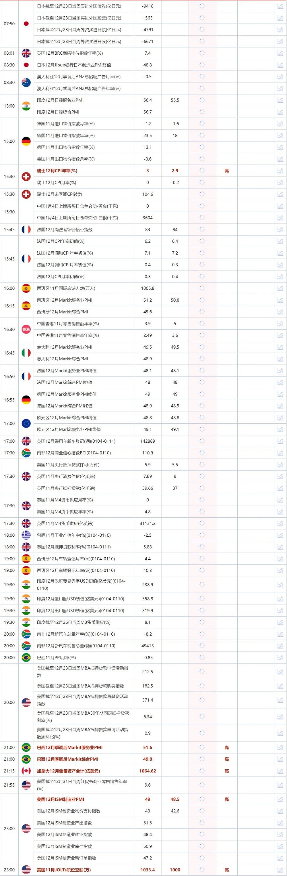 23:00 美国12月ISM制造业PMI , 前值 49 , 预期值 48.5 , 公布值:待发布23:00 美国12月ISM制造业物价支付指数 , 前值 43 , 预期值 42.6 , 公布值:待发布