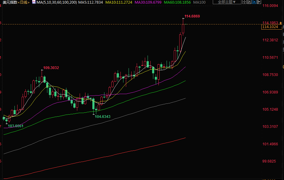 美元兑一篮子货币周一上涨,盘中触及刷新二十年新高至114.68。
