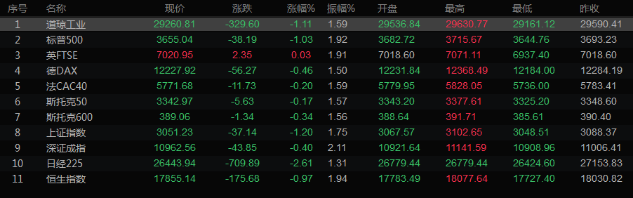 美股收盘情况:道琼斯工业指数下跌1.11%,收于29260.81点;