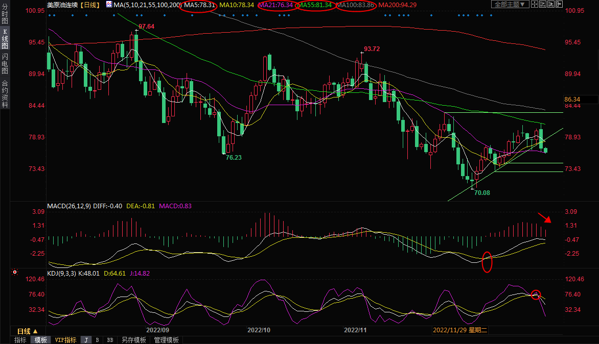 震荡;油价上一交易日受到55日均线压制后大幅走弱,跌破了70关口以来的短线上涨趋势线,录得大阴线,基本宣告过去一周的震荡走势结束,KDJ重新结成死叉,短线看空信号显著增加,目前正试探21日均线76.34附近支撑,预计跌破该支撑的可能性较大,进一步支撑参考12月20日低点74.44附近支撑,12月16日低点支撑在73.31附近,布林线下轨支撑在71.39附近,该位置支撑相对较强,能否进一步下破还有待观察。