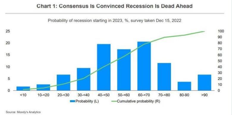 穆迪预计,2023年第三季度美国GDP增长率将在0.8%触底。赞迪和他的团队预计,在2024年第三季度之前,美国的GDP增长率不会超过2%。《华尔街日报》一项调查的预测中值显示,经济学家认为美国经济2023年陷入经济衰退的几率约为65%。下图显示了2023年美国经济陷入衰退的可能性,其中蓝色柱代表衰退可能性,绿色线代表累积起来的可能性,可以看到随着时间推移,陷入衰退的概率整体在不断上升