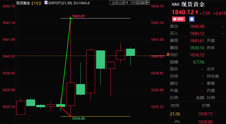 现货黄金一度跳升逾8美元至1843.61美元/盎司。