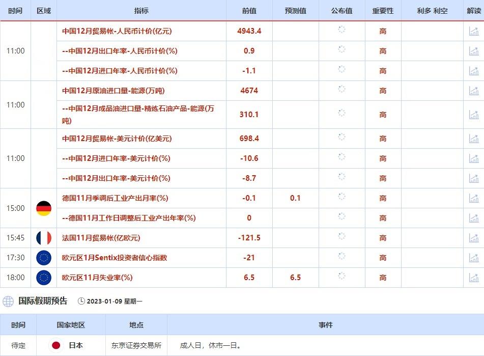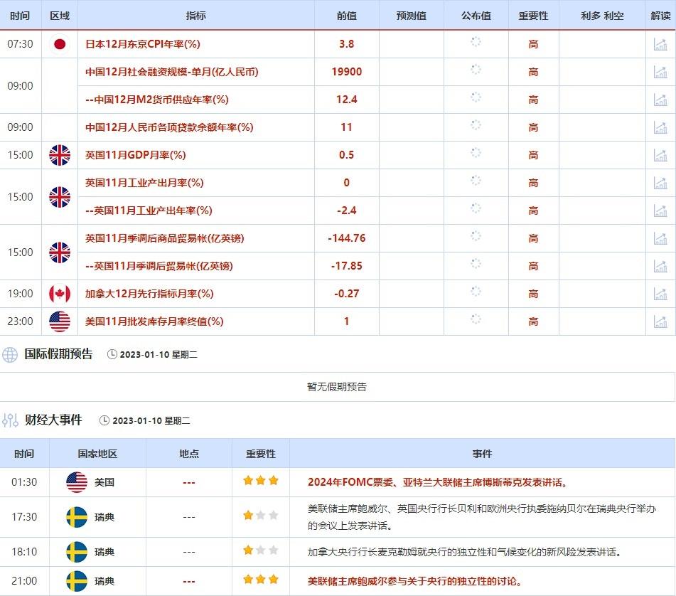 1月9日,欧元区将公布11月失业率,市场预期为6.5%,和前值相同。 1月9日当天,日本东京证券交易所因为成人日,休市一日。②1月10日(周二)关键字:日本12月CPI,亚特兰大联储主席博斯蒂克