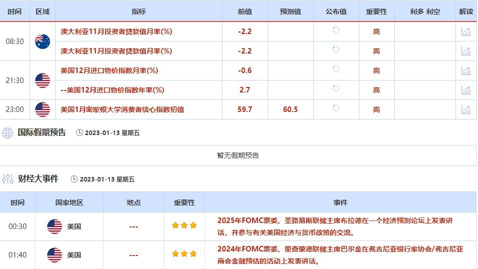 1月13日,美国将公布美国1月密歇根大学消费者信心指数初值,目前市场预期为60.5,好于59.7的前值。 1月13日,圣路易斯联储主席布拉德在一个经济预测论坛上发表讲话,并参与有关美国经济与货币政策的交流。里奇蒙德联储主席巴尔金在弗吉尼亚银行家协会/弗吉尼亚商会金融预估的活动上发表讲话。投资者需关注这两位美联储官员的讲话,或影响未来市场走势。