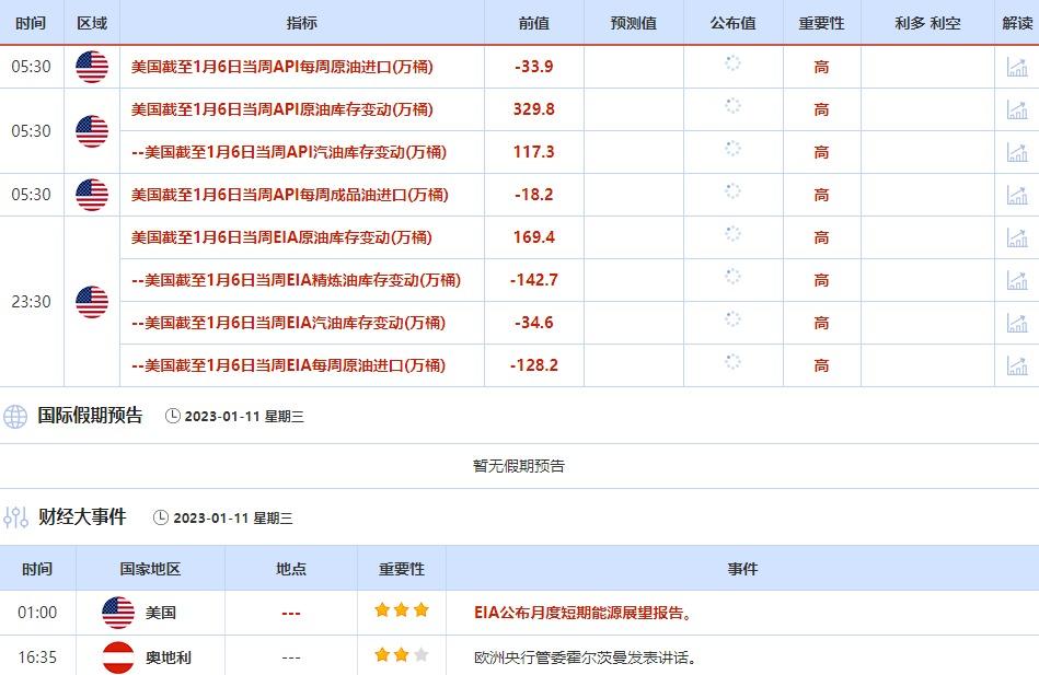 1月11日,美国将公布截至1月6日当周API和EIA原油库存变动,EIA公布月度短期能源展望报告,或影响油价走势,投资者需重点关注。