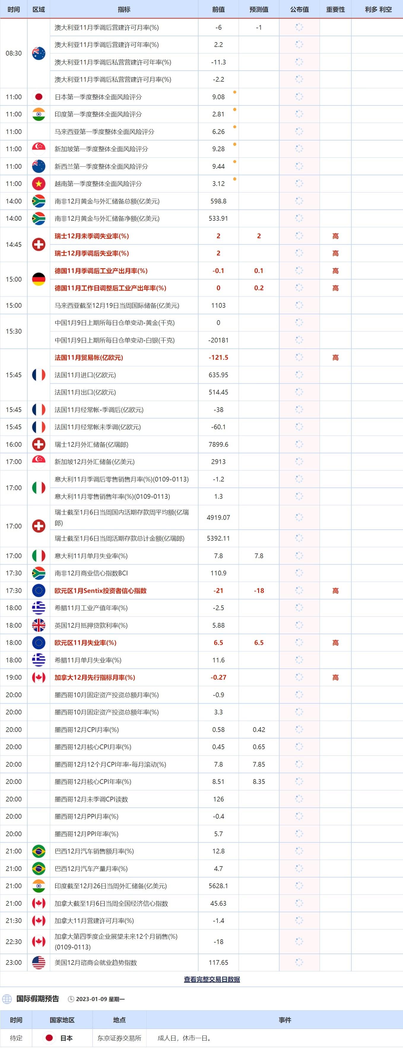 15:00 德国11月工作日调整后工业产出年率(%) , 前值 0 , 预期值 0.2 , 公布值:待发布15:00 马来西亚截至12月19日当周国际储备(亿美元) , 前值 1103 , 预期值 -- , 公布值:待发布