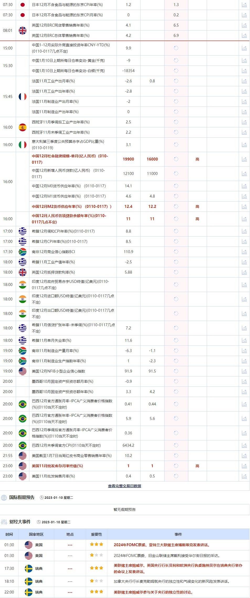 汇通财经APP讯——1月10日,投资者需要关注的重点数据:日本12月东京CPI年率,中国12月人民币各项贷款余额年率,中国12月社会融资规模-单月,中国12月M2货币供应年率和美国11月批发库存月率终值。需要关注的大事件包括美联储主席鲍威尔、英国央行行长贝利和欧洲央行执委施纳贝尔在瑞典央行举办的会议上发表讲话;美联储主席鲍威尔参与关于央行的独立性的讨论。