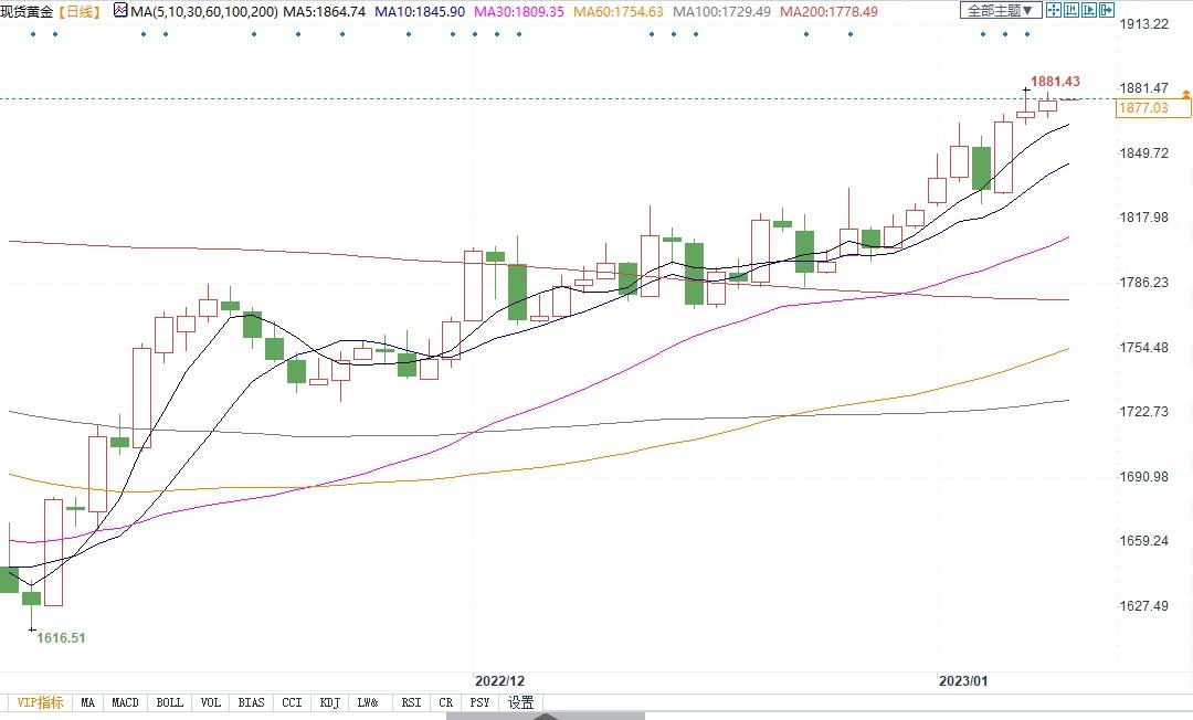 2023年年初,黄金价格再度上涨,自年初以来上涨了2.7%。MKS PAMP金属策略主管Nicky Shiels说:“黄金也继续密切追踪美元走势。金价仍保持在1880美元下方的窄幅区间,且与美元走势一致。”