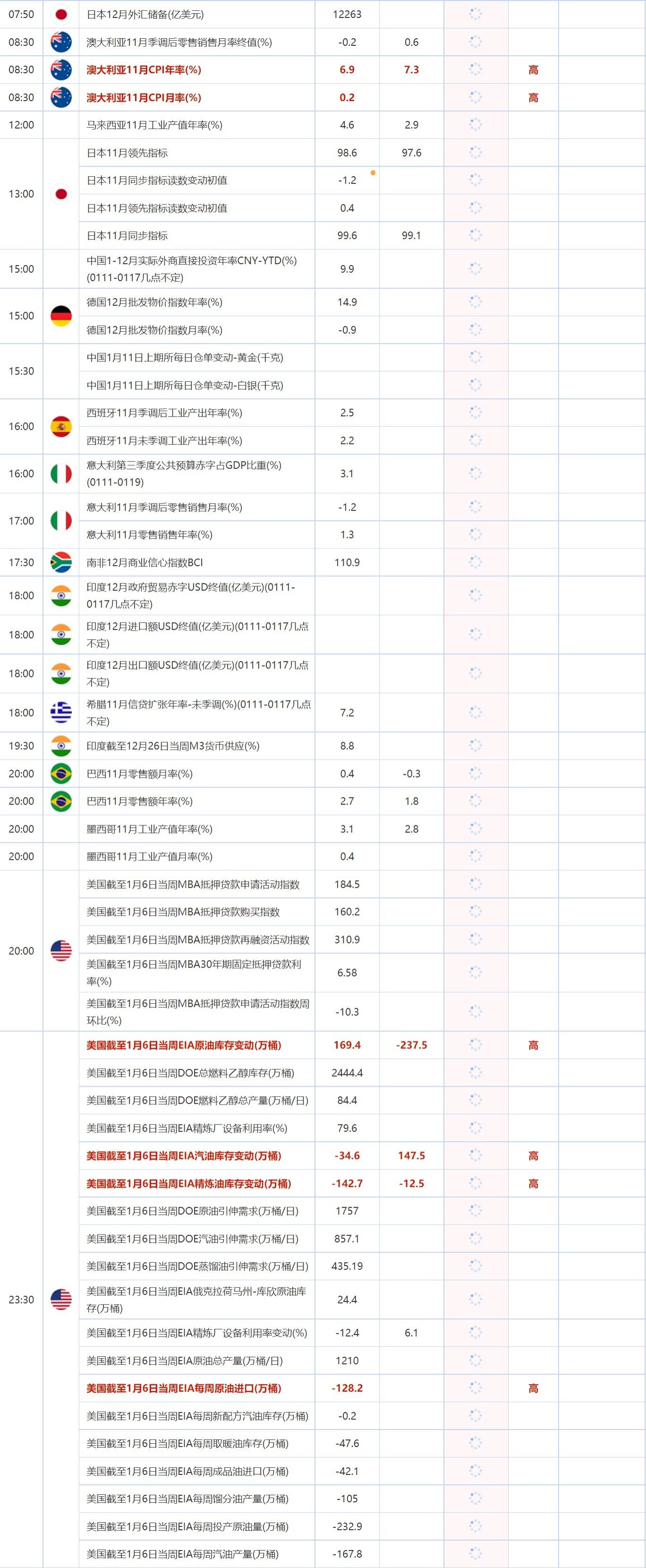 08:30 澳大利亚11月CPI月率(%) , 前值 0.2 , 预期值 -- , 公布值:待发布12:00 马来西亚11月工业产值年率(%) , 前值 4.6 , 预期值 2.9 , 公布值:待发布