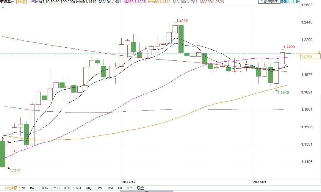 英镑兑美元已经大幅扭转了进入2023年后的跌势,如果全球市场继续上涨,本周汇价可能会进一步上涨,1.23是技术阻力位。但是,美联储官员的公开言论,本周四将公布的美国12月CPI数据是