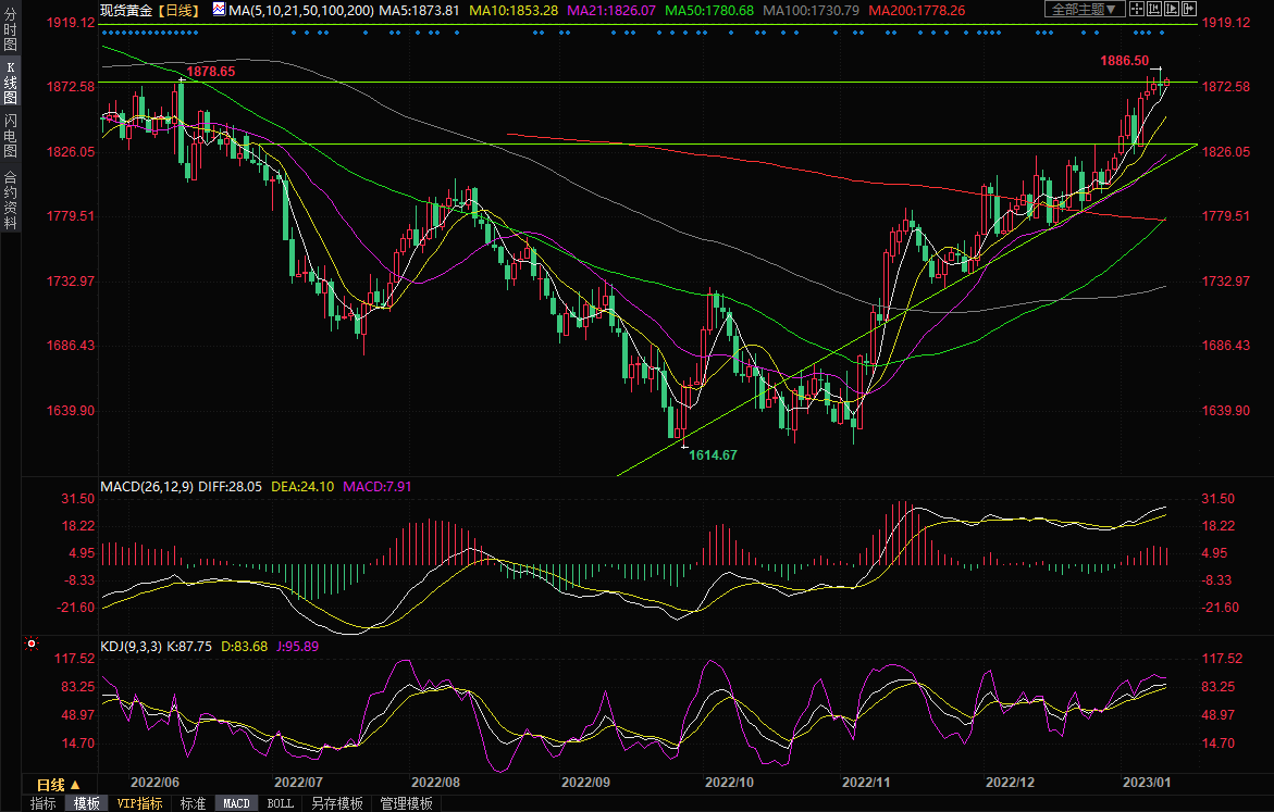 整体来看,对美国通胀增速放缓的预期居高不下,市场对美联储年底将降息的预期也有所升温,美元指数维持弱势并面临进一步下探风险,这给金价提供支撑,对地缘局势和全球经济衰退的担忧也支撑金价,金价短中线仍有进一步冲高机会,继续关注1900关口和1920关口支撑。但金价短线也面临一定的见顶风险,仍需提防“靴子落地”行情(金价先涨后跌或者冲高回落)的可能性,此外,投资者还需提防通胀数据强于预期的可能性,下方关注10日均线1853.16附近支撑。北京时间09:58,
