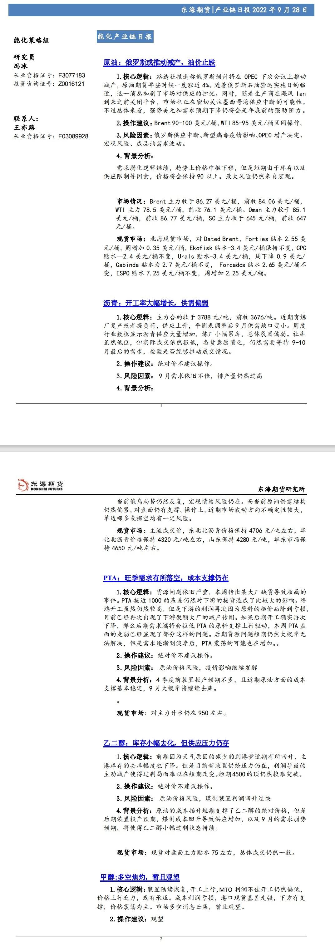 标题:【东海期货9月28日产业链日报】能化篇:俄罗斯或推动减产,油价止跌