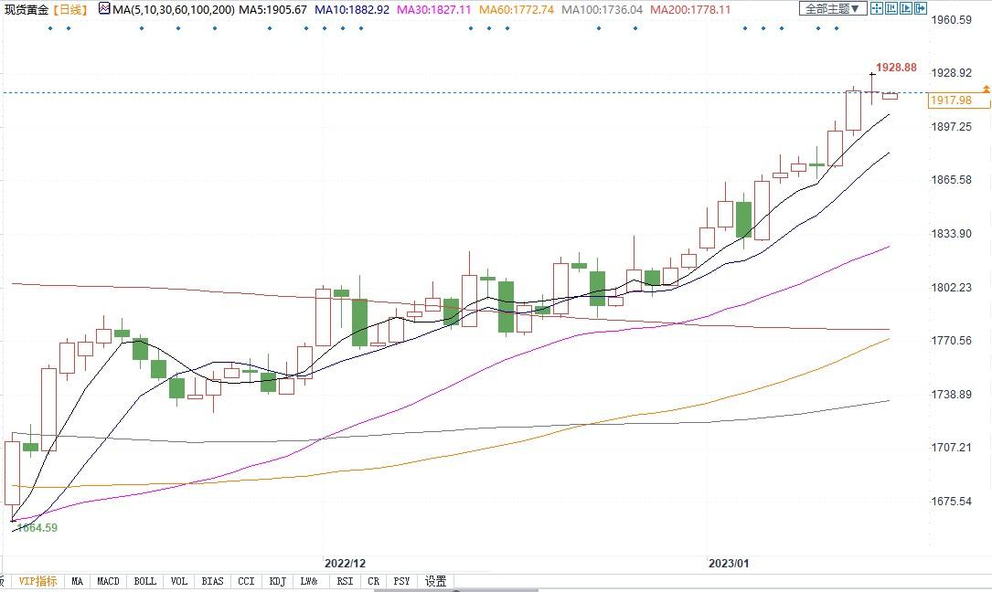 黄金现货价格已突破每盎司1900美元,自2022年11月初以来上涨了约18%,原因是美国通胀压力消退,市场预计美联储的货币政策不会那么激进。