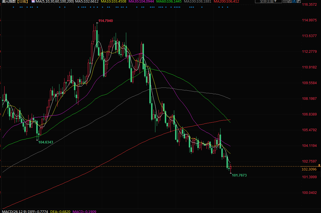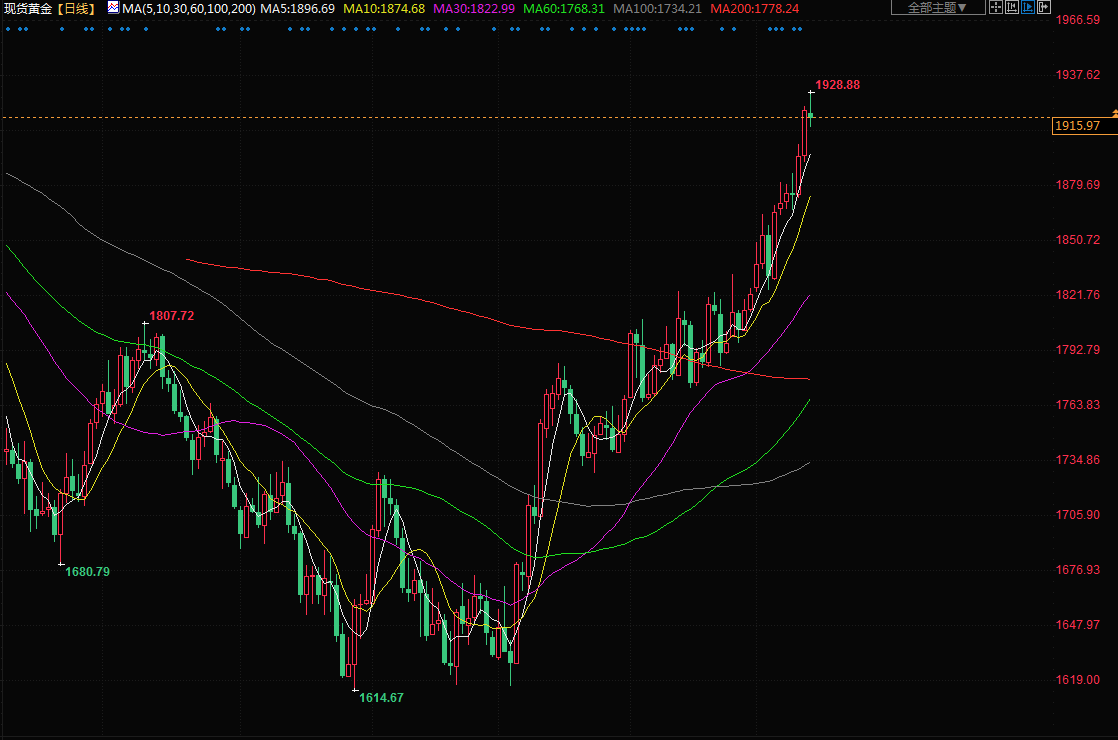 金价周一从逾八个月高点回落,但仍持于每盎司1900美元的关键水平之上,因市场预期美联储在加息问题上将不那么激进。现货金下跌0.3%,至每盎司1914.16美元,盘中稍早触及4月底以来最高1929美元。