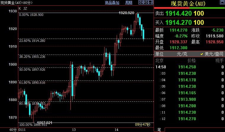 现货黄金下跌0.16%至1916.95美元/盎司;COMEX期金主力合约下跌0.09%至1920.0美元/盎司;