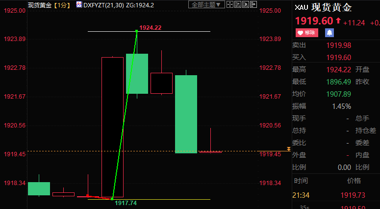现货黄金上涨逾6美元至1924.22美元/盎司后回吐逾半数涨幅。