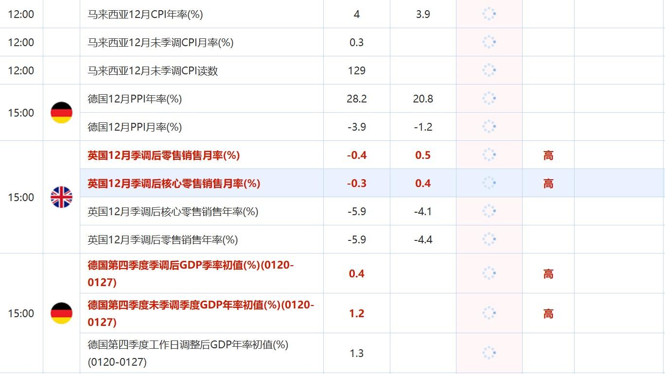 15:00 英国12月季调后核心零售销售月率(%) , 前值 -0.3 , 预期值 0.4 , 公布值:待发布15:00 英国12月季调后核心零售销售年率(%) , 前值 -5.9 , 预期值 -4.1 , 公布值:待发布