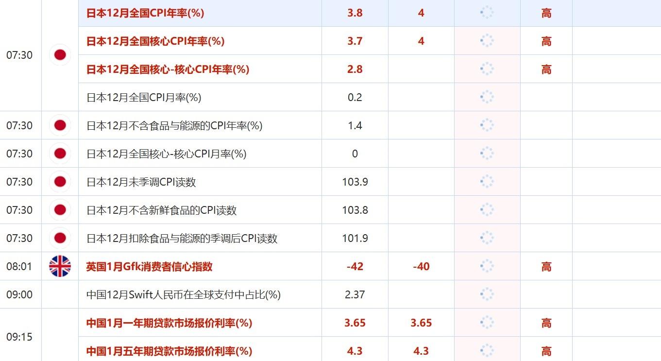 07:30 日本12月全国CPI年率(%) , 前值 3.8 , 预期值 4 , 公布值:待发布07:30 日本12月全国核心CPI年率(%) , 前值 3.7 , 预期值 4 , 公布值:待发布07:30 日本12月全国核心-核心CPI年率(%) , 前值 2.8 , 预期值 -- , 公布值:待发布