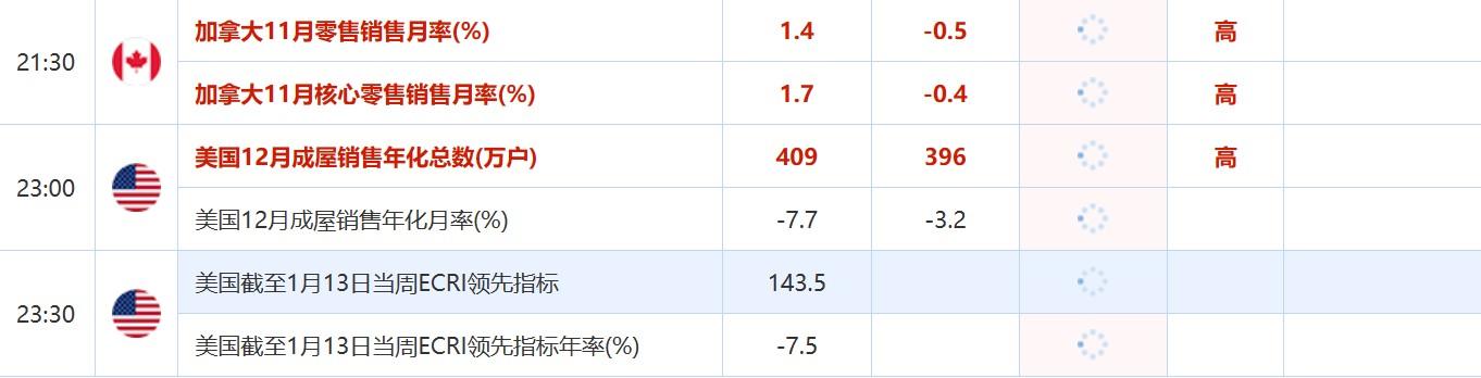 21:30 加拿大11月核心零售销售月率(%) , 前值 1.7 , 预期值 -0.4 , 公布值:待发布23:00 美国12月成屋销售年化总数(万户) , 前值 409 , 预期值 396 , 公布值:待发布23:00 美国12月成屋销售年化月率(%) , 前值 -7.7 , 预期值 -3.2 , 公布值:待发布