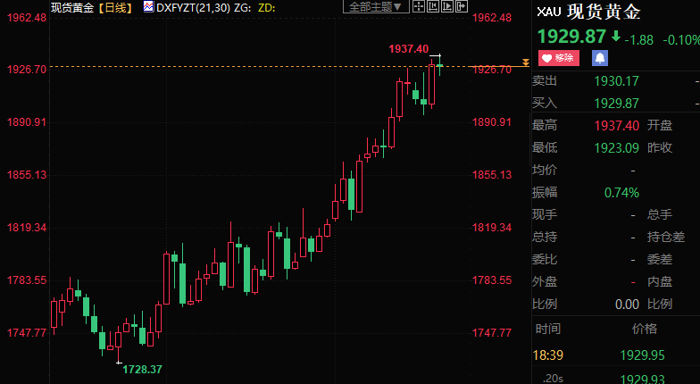 现货黄金本周累计上涨0.52%至1929.92美元/盎司;