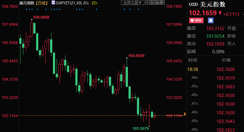 美元指数本周下跌0.02%至102.163,盘中一度跌创6月3日以来新低至101.508。