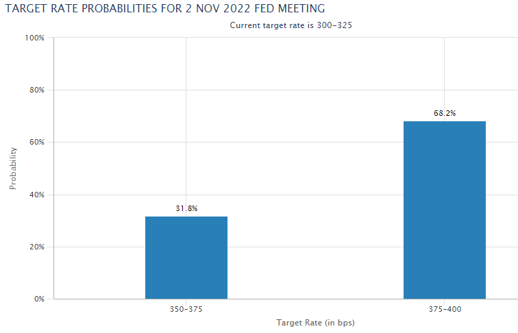 根据芝商所编制的联邦基金利率期货合约分析,投资者目前认为美联储在11月1日至2日的下次政策会议上连续第四次加息75个基点的可能性接近70%。