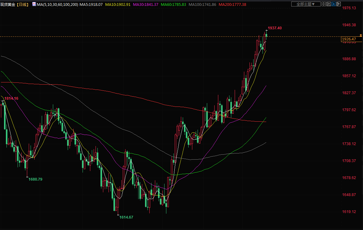 金价上周五下跌,美元走强,不过,金价周线仍连续第五周上涨,受助于美联储放缓步伐加息的希望。现货金下跌0.2%,至每盎司1928.06美元,盘中稍早一度触及4月22日以来最高的1937.49美元。本周迄今,现货金已涨0.4%。