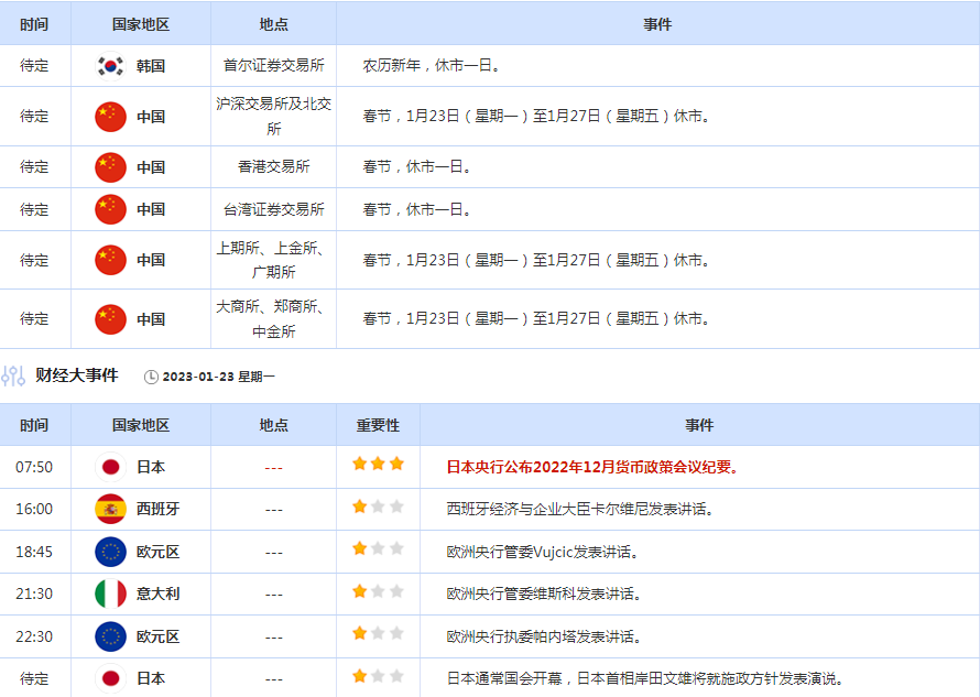 汇通财经APP讯——1月23日(周一),本周需关注日本央行将货币政策会议纪要,日本首相岸田文雄将就施政方针发表演说;欧洲央行行长拉加德将发表讲话,从中寻求欧洲央行政策路径信息,加拿大央行发布利率决议,春节假期交投相对清淡,但还需注意市场不确定性风险。