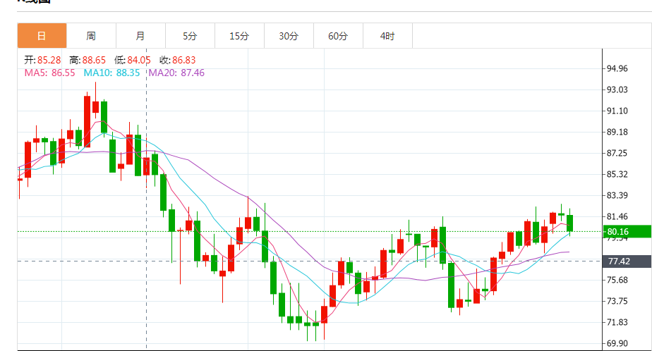 布伦特原油期货下跌2.3%,收报每桶86.13美元。美国原油期货下跌1.8%,收报每桶80.13美元;美国期金收涨0.4%,报每盎司1935.4美元。