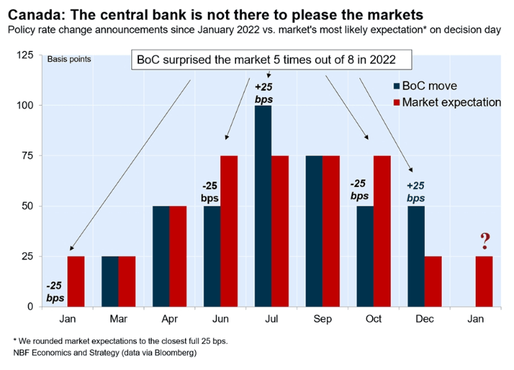 如下图所示,在2022年的八次决议中,加拿大央行加息了五次